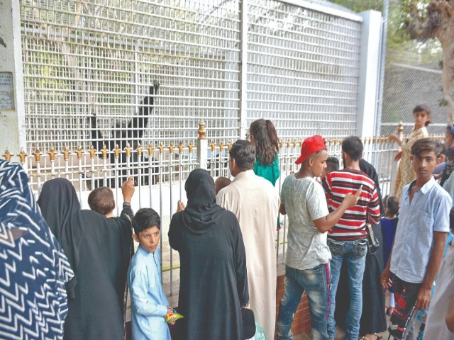 Behind the iron bars, a pair of ancient eyes watches the crowds come and go. His hands, meant for forests and sun-warmed branches, rest on cold steel. In the hush between camera clicks and children’s cheers, his heart remembers the freedom of sky, the rustle of leaves, the language of wind. Photo: Jalal Qureshi/express