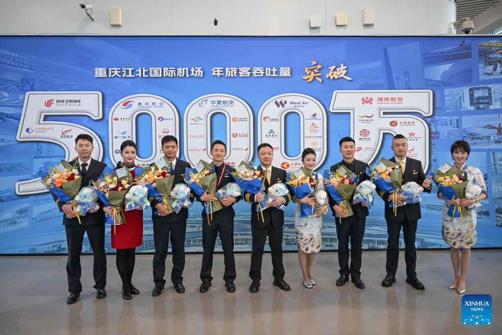 Crew members pose for a group photo in front of the commemorative wall marking the annual passenger throughput exceeding 50 million of Chongqing Jiangbei International Airport in Chongqing, southwest China, Dec. 31, 2025. The combined economic output of southwest China’s Sichuan Province and Chongqing Municipality has exceeded 10 trillion yuan (about 1.44 trillion U.S. dollar) in 2025, accounting for approximately 7.2 percent of the national total. (Xinhua/Chen Cheng)