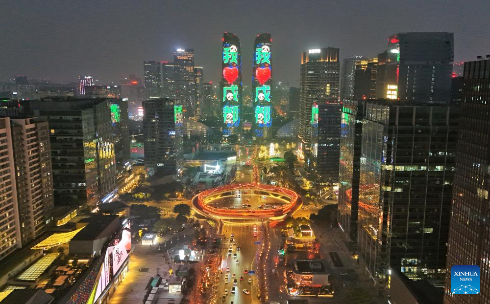 An aerial drone photo taken on Jan. 5, 2025 shows a night view of Chengdu, southwest China’s Sichuan Province. The combined economic output of southwest China’s Sichuan Province and Chongqing Municipality has exceeded 10 trillion yuan (about 1.44 trillion U.S. dollar) in 2025, accounting for approximately 7.2 percent of the national total. (Xinhua/Liu Kun)