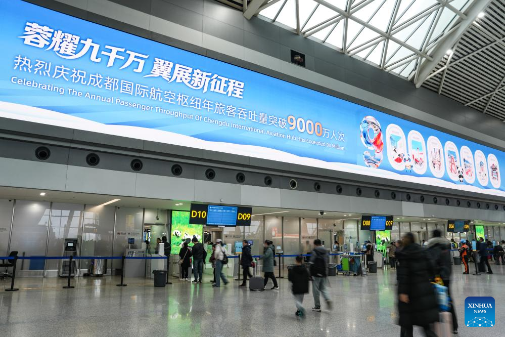 This photo taken on Dec. 31, 2025 shows a digital board displaying the annual passenger throughput of the Chengdu International Aviation Hub surpassed 90 million for the first time at Terminal 2 of the Chengdu Shuangliu International Airport in Chengdu, southwest China’s Sichuan Province. The combined economic output of southwest China’s Sichuan Province and Chongqing Municipality has exceeded 10 trillion yuan (about 1.44 trillion U.S. dollar) in 2025, accounting for approximately 7.2 percent of the national total. (Xinhua/Wang Xi)