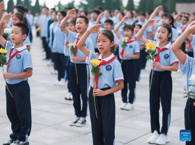 Students present flowers to martyrs at a memorial museum in Nanchang, east China’s Jiangxi Province, Sept. 30, 2025. China observed its 12th Martyrs’ Day on Tuesday with commemorations held across the country to honor fallen national heroes. (Xinhua/Wan Xiang)