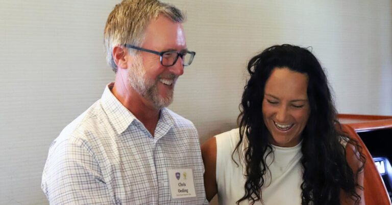 Chris Oeding smiles while speaking at the 40th annual USA Water Polo Hall of Fame induction ceremony on Friday.