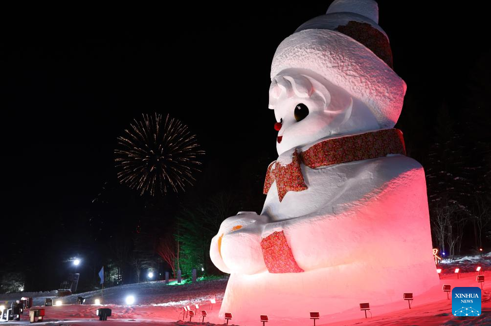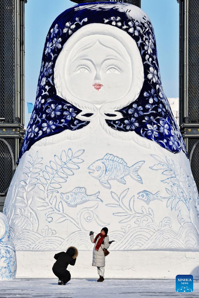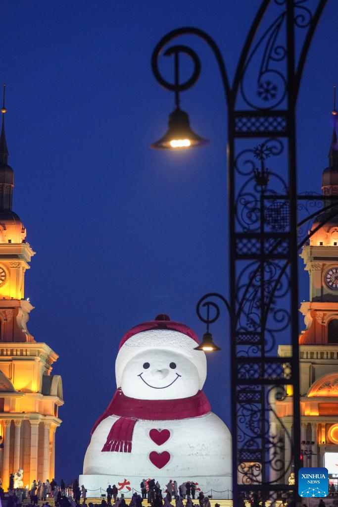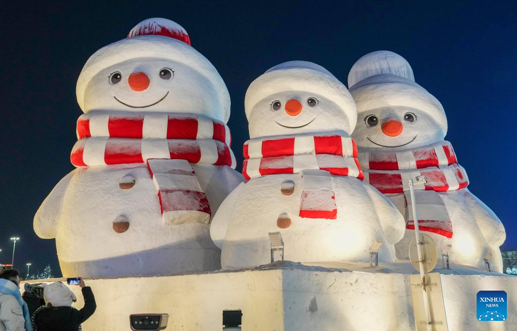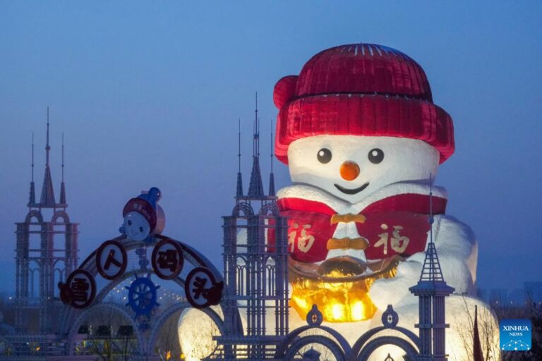 This photo taken on Jan. 10, 2026 shows a giant snowman at a scenic spot in Harbin, northeast China’s Heilongjiang Province. With the arrival of the ice and snow season, various public facilities in Heilongjiang Province have created distinctive snowman-themed landscapes to attract locals and tourists. (Xinhua/Wang Jianwei)