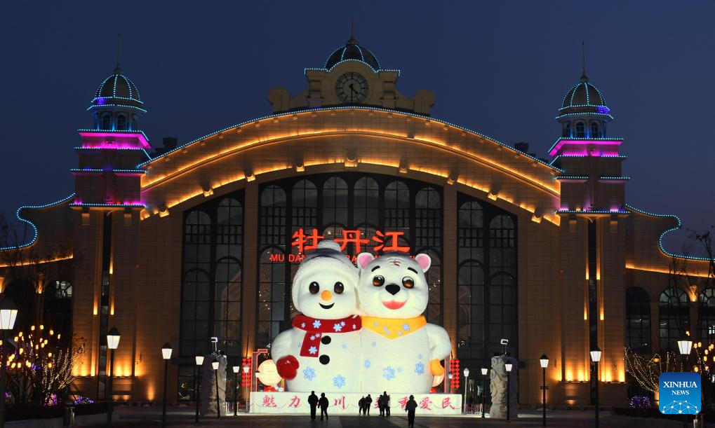 This photo taken on Jan. 15, 2026 shows giant snowmen at the north square of the Mudanjiang Railway Station in Mudanjiang, northeast China’s Heilongjiang Province. With the arrival of the ice and snow season, various public facilities in Heilongjiang Province have created distinctive snowman-themed landscapes to attract locals and tourists. (Photo by Zhang Chunxiang/Xinhua)