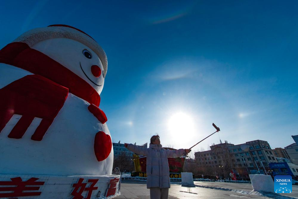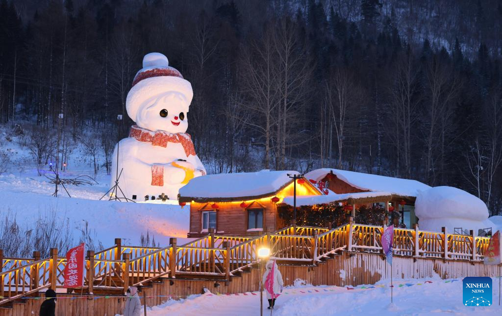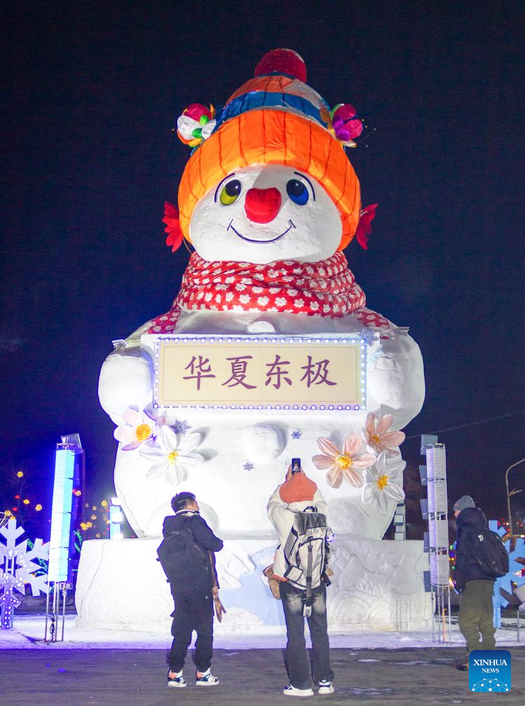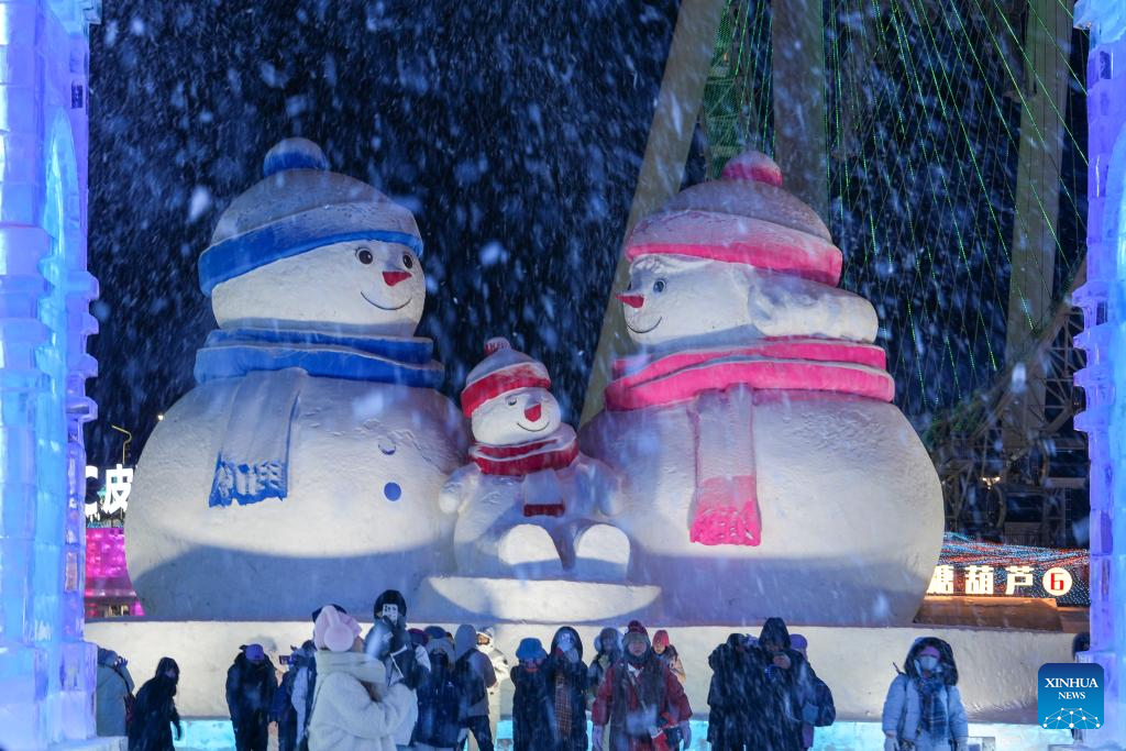 Tourists enjoy themselves at a scenic area in Mudanjiang, northeast China’s Heilongjiang Province, Jan. 1, 2026. With the arrival of the ice and snow season, various public facilities in Heilongjiang Province have created distinctive snowman-themed landscapes to attract locals and tourists. (Photo by Sun Tingyi/Xinhua)