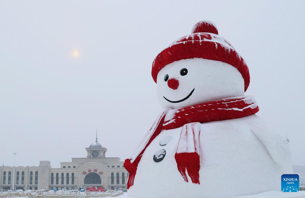This photo taken on Jan. 10, 2026 shows a giant snowman in front of the Suifenhe Railway Station in Suifenhe City, northeast China’s Heilongjiang Province. With the arrival of the ice and snow season, various public facilities in Heilongjiang Province have created distinctive snowman-themed landscapes to attract locals and tourists. (Photo by Qu Yiwei/Xinhua)