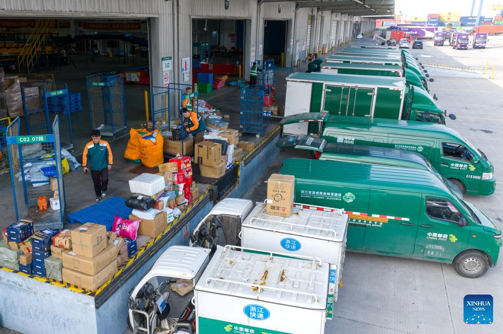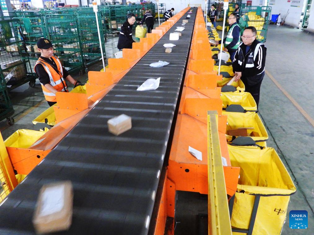 Staff members work at an intelligent parcel sorting line at a branch of China Post in Dazhou, southwest China’s Sichuan Province, Nov. 10, 2025. E-commerce and logistics companies across China are busy selling, packaging and delivering goods in the run-up to the annual “Double Eleven” shopping festival which falls on Nov. 11. (Photo by Deng Liangkui/Xinhua)