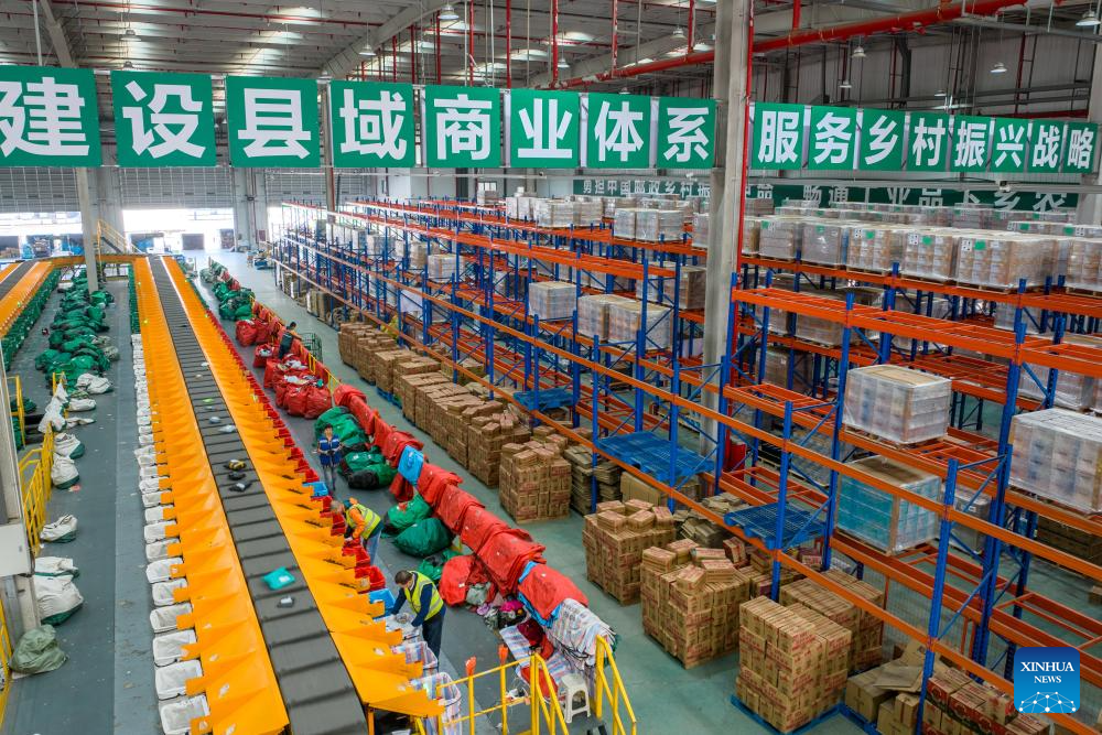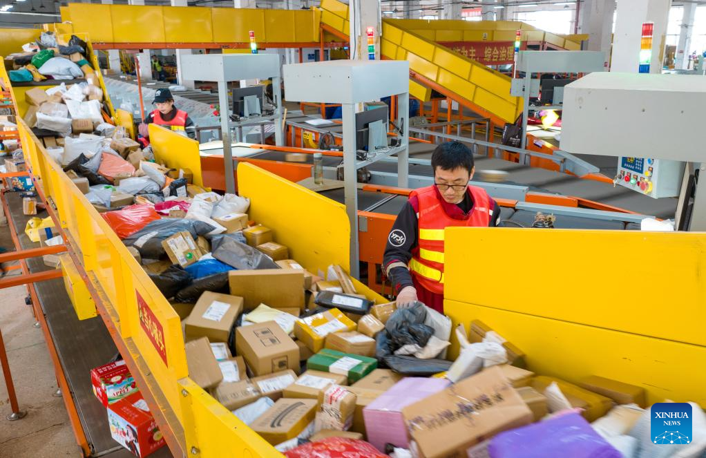 A delivery worker sorts parcels at a branch of China Post in Xiayi County of Shangqiu, central China’s Henan Province, Nov. 9, 2025. E-commerce and logistics companies across China are busy selling, packaging and delivering goods in the run-up to the annual “Double Eleven” shopping festival which falls on Nov. 11. (Photo by Miao Yucai/Xinhua)