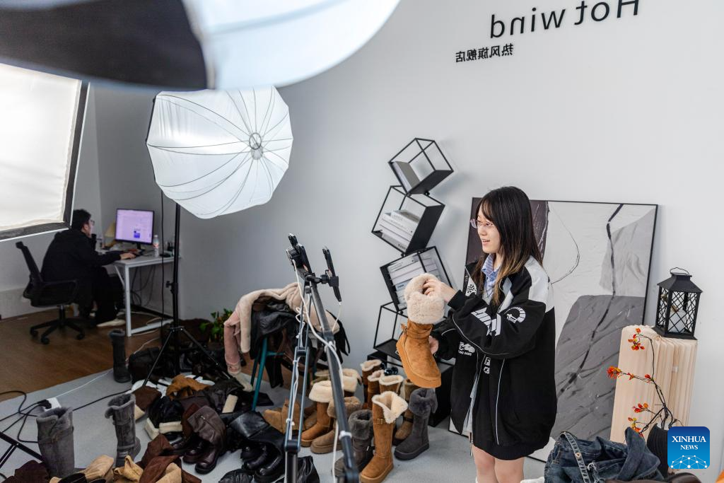 A staff member promotes shoes via live streaming at a network technology company in Ouhai District of Wenzhou, east China’s Zhejiang Province, Nov. 10, 2025. E-commerce and logistics companies across China are busy selling, packaging and delivering goods in the run-up to the annual “Double Eleven” shopping festival which falls on Nov. 11. (Photo by Liu Jili/Xinhua)