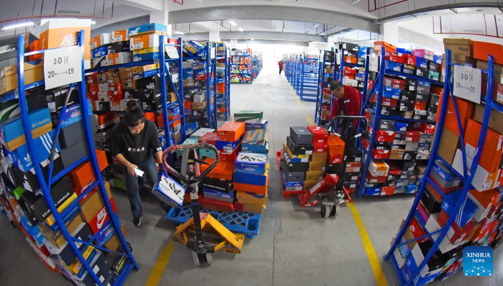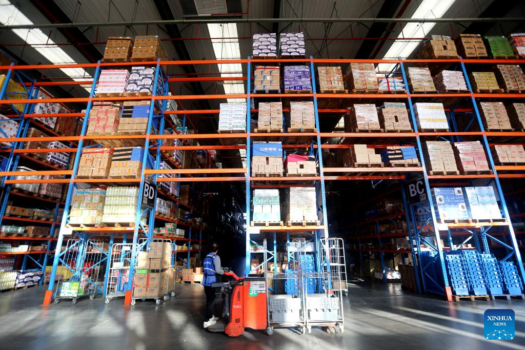 A staff member transports goods at a warehouse in Lianyun District of Lianyungang, east China’s Jiangsu Province, Nov. 10, 2025. E-commerce and logistics companies across China are busy selling, packaging and delivering goods in the run-up to the annual “Double Eleven” shopping festival which falls on Nov. 11. (Photo by Wang Chun/Xinhua)