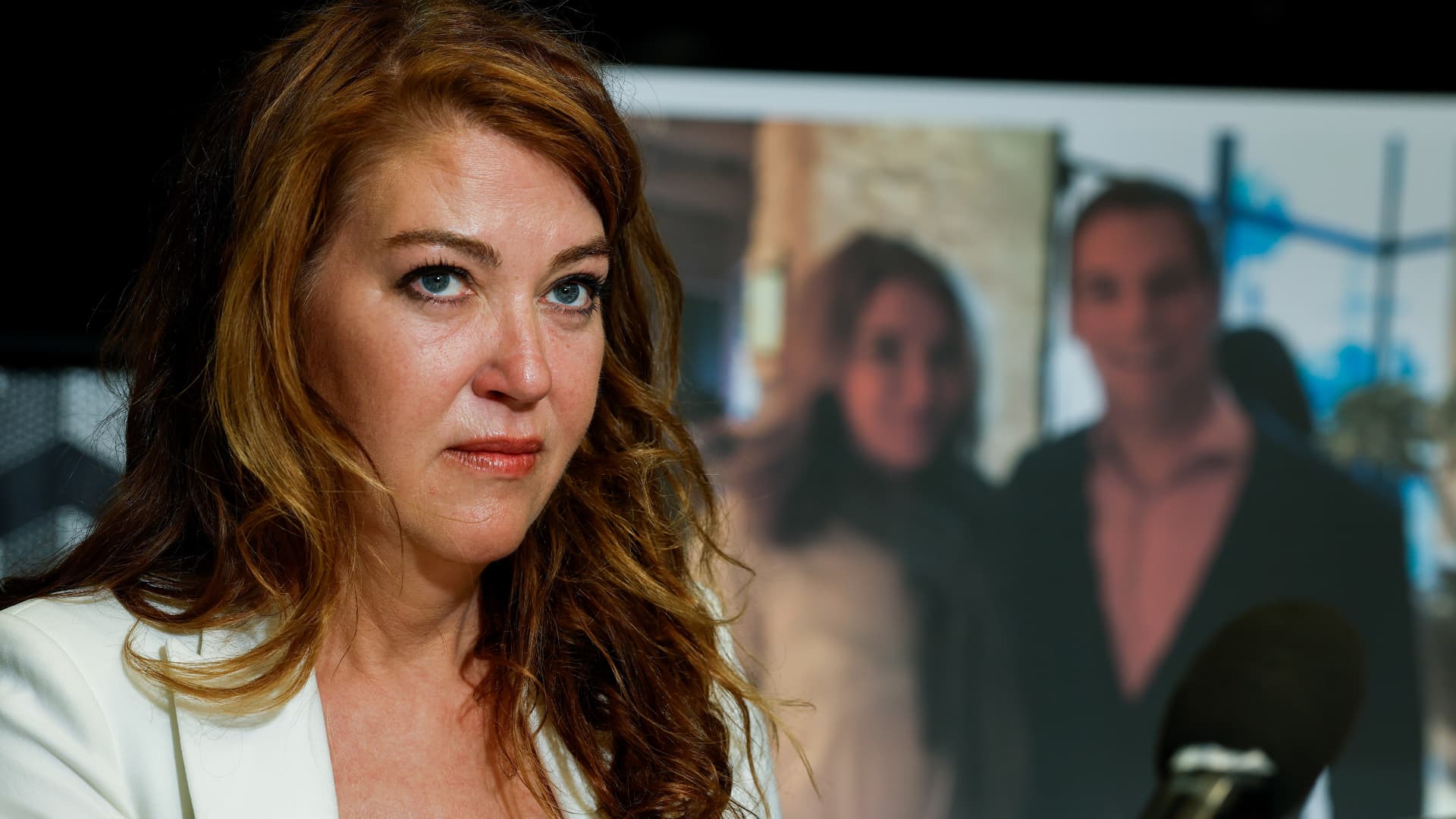 Lonna Drewes reacts during a press conference alleging U.S. Rep. Eric Swalwell (D-CA) sexually assaulted her alongside a photo of Drewes with Swalwell (R) on April 14, 2026 in Beverly Hills, California.
