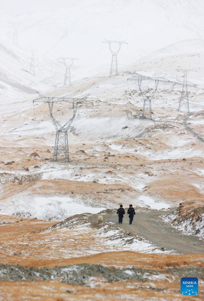 Staff members of a power company patrol along a 750-kilovolt (kV) power transmission line in Hejing County of Mongolian Autonomous Prefecture of Bayingolin, northwest China’s Xinjiang Uygur Autonomous Region, Oct. 2, 2025. Workers from all walks of life have been standing fast at their posts and fulfilling their duties with full dedication during the eight-day National Day and Mid-Autumn Festival holiday. (Photo by Zhang Limin/Xinhua)