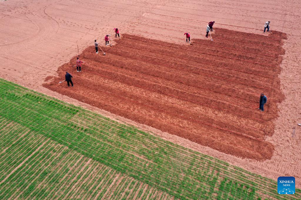 An aerial drone photo taken on Feb. 25, 2026 shows farmers working in the fields of Dongwangqu Village, Qinyang City, central China’s Henan Province. After the Spring Festival holiday, farmers are busy with agricultural production in the farming season across the country. (Photo by Yang Fan/Xinhua)