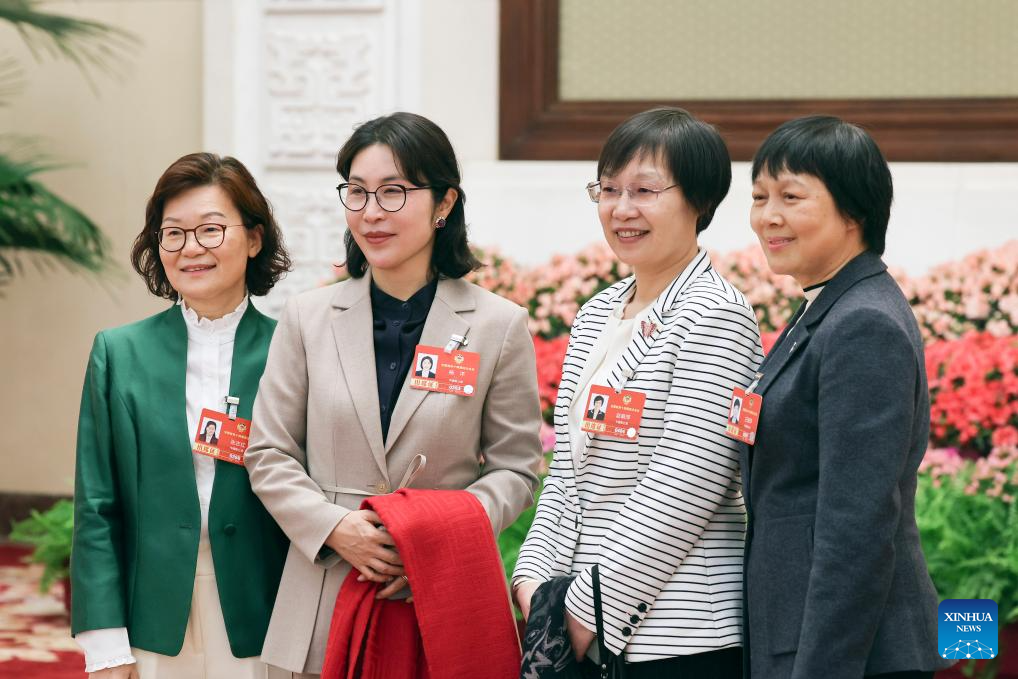 Guo Hongjing (C), a deputy to the 14th National People’s Congress (NPC), talks with other lawmakers before a group meeting of deputies from the delegation of Tianjin at the fourth session of the 14th NPC in Beijing, capital of China, March 6, 2026.
