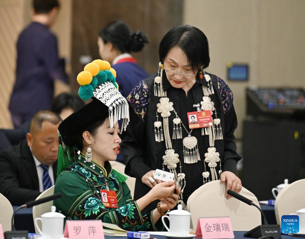 Jin Ruirui (L, front), a deputy to the 14th National People’s Congress (NPC), talks with another lawmaker before a group meeting of deputies from the delegation of Yunnan Province at the fourth session of the 14th NPC in Beijing, capital of China, March 7, 2026.