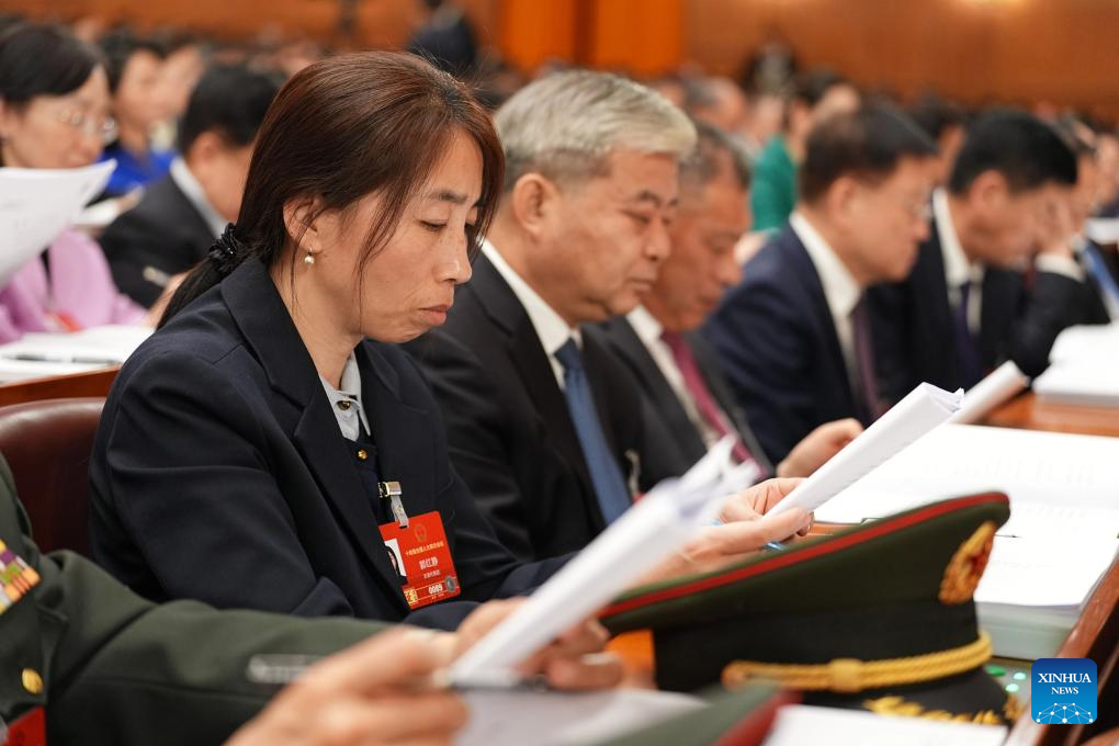 Guo Hongjing (L), a deputy to the 14th National People’s Congress (NPC), attends the opening meeting of the fourth session of the 14th NPC at the Great Hall of the People in Beijing, capital of China, March 5, 2026.