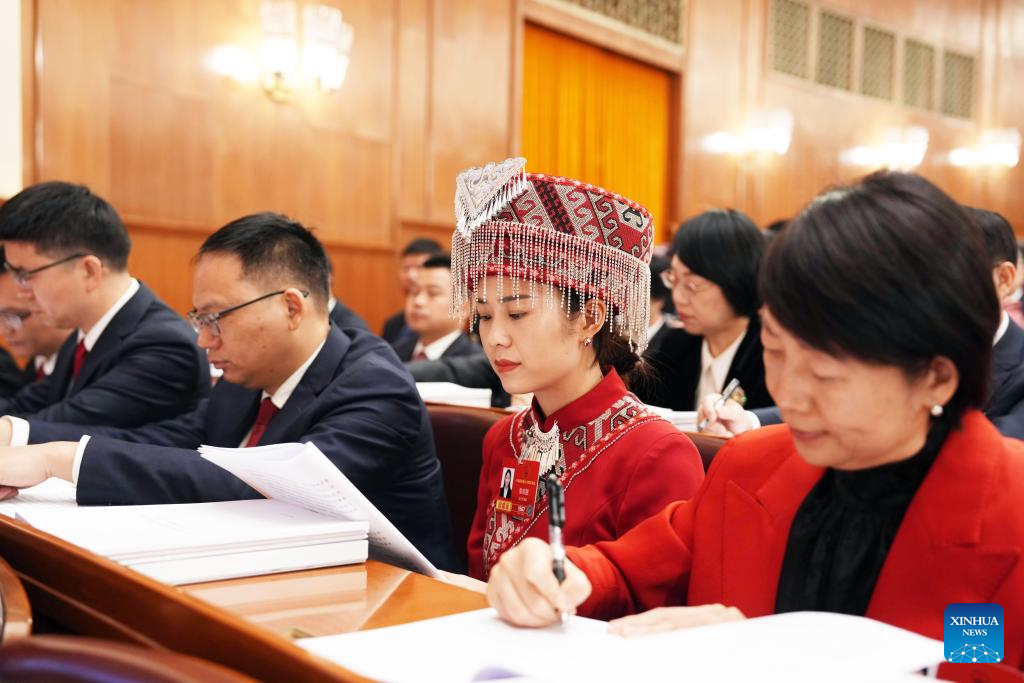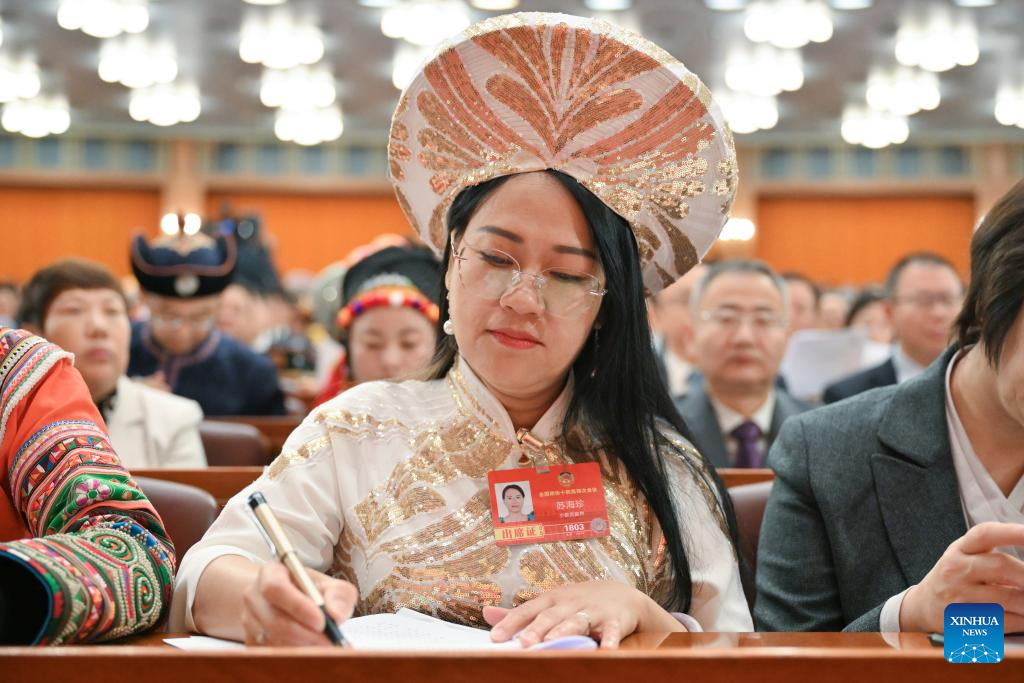 Jin Ruirui (2nd L), a deputy to the 14th National People’s Congress (NPC), attends the opening meeting of the fourth session of the 14th NPC at the Great Hall of the People in Beijing, capital of China, March 5, 2026.