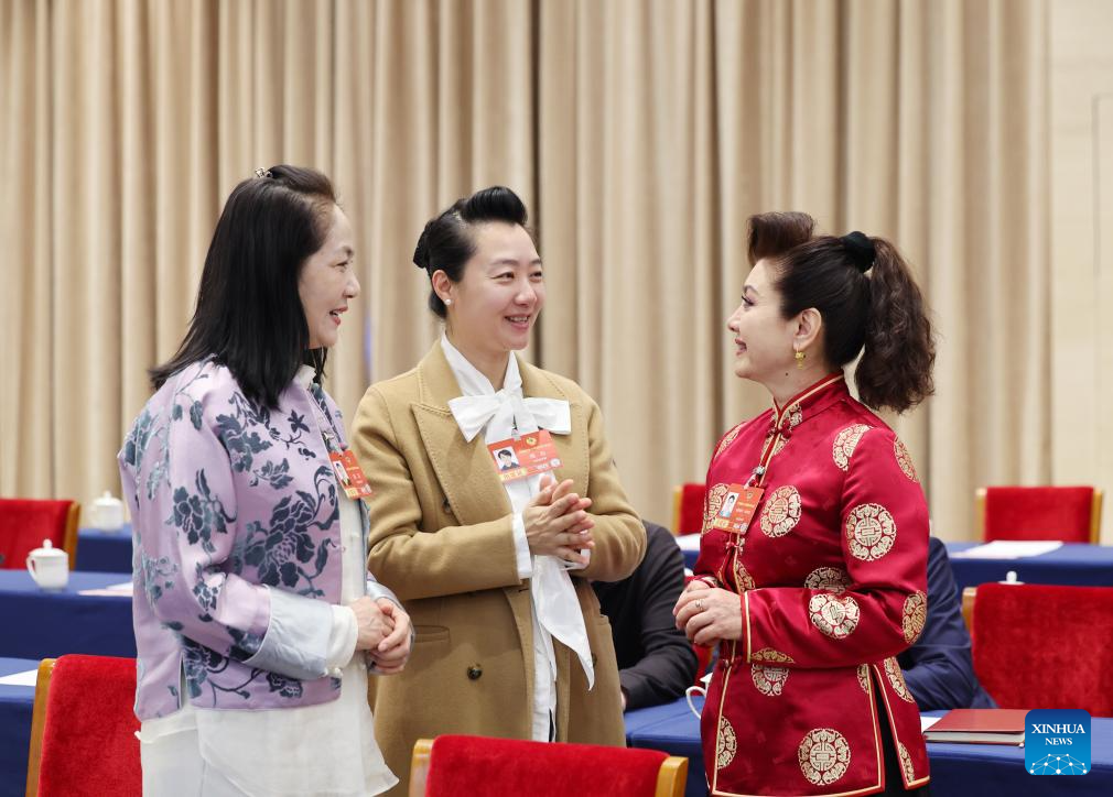 Dilinar Abdulla (R), Zhou Li (C) and Miao Jie, members of the 14th National Committee of the Chinese People’s Political Consultative Conference (CPPCC), communicate before a joint group meeting of political advisors from the sectors of literature, the arts and sports at the fourth session of the 14th CPPCC National Committee in Beijing, capital of China, March 6, 2026.