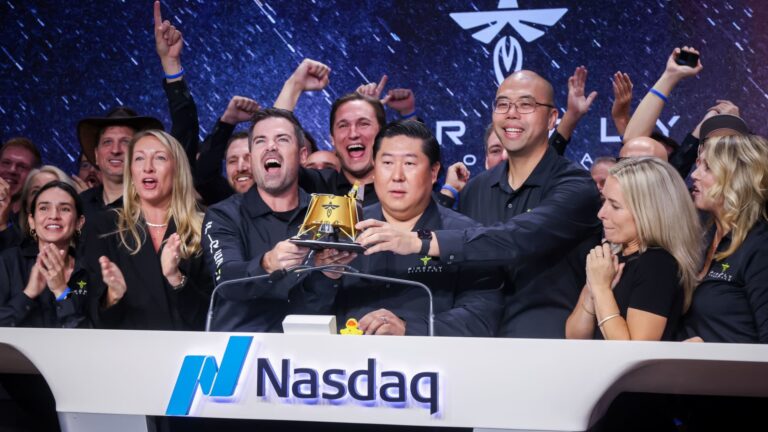 Jason Kim, chief executive officer of Firefly Aerospace, center, during the company’s initial public offering at the Nasdaq MarketSite in New York, US, on Thursday, Aug. 7, 2025.