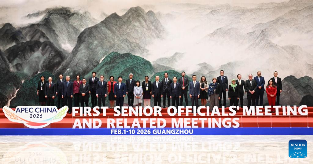 Representatives attending the First Senior Officials’ Meeting of APEC China 2026 pose for a group photo in Guangzhou, south China’s Guangdong Province, Feb. 10, 2026. The opening session of the First Senior Officials’ Meeting of APEC China 2026 was held here on Tuesday. (Xinhua/Deng Hua)