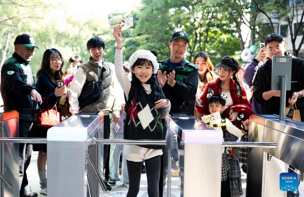 A child shows her ticket to the Panda world at the entrance in Fuzhou, southeast China’s Fujian Province on Jan. 17, 2026. Five giant pandas, arriving from Chengdu, met the public at the reopened Fuzhou Panda World on Saturday, following a 20-day adaptation period. (Xinhua/Wei Peiquan)