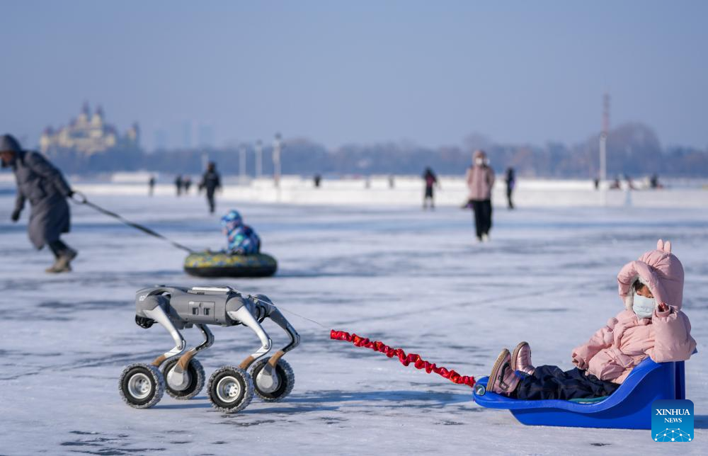 A child rides sled pulled by a robotic dog on the frozen surface of the Songhua River in Harbin, northeast China’s Heilongjiang Province, Jan. 11, 2026. The surface of the Harbin section of Songhua River, now solidly frozen, serves as a “fun field,” where locals and tourists alike enjoy themselves with ice-and-snow-themed amusements. (Xinhua/Wang Jianwei)