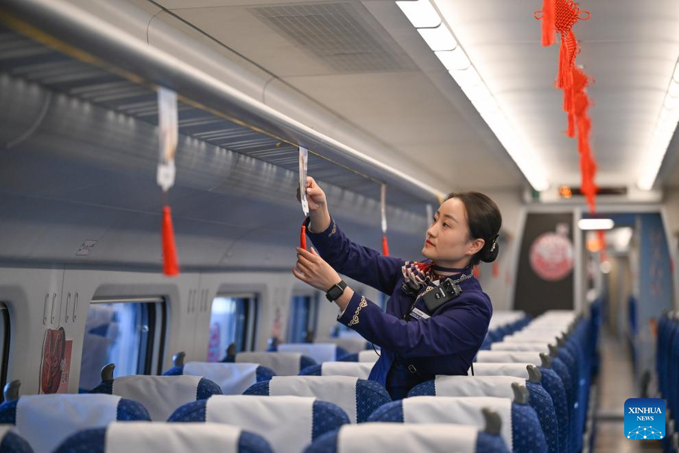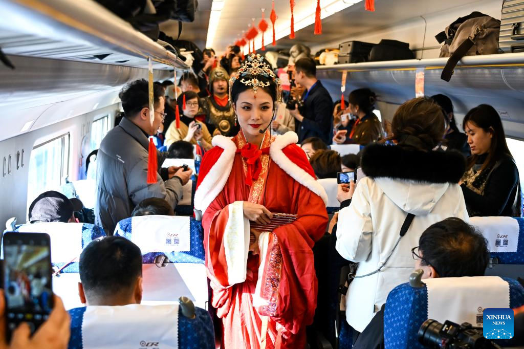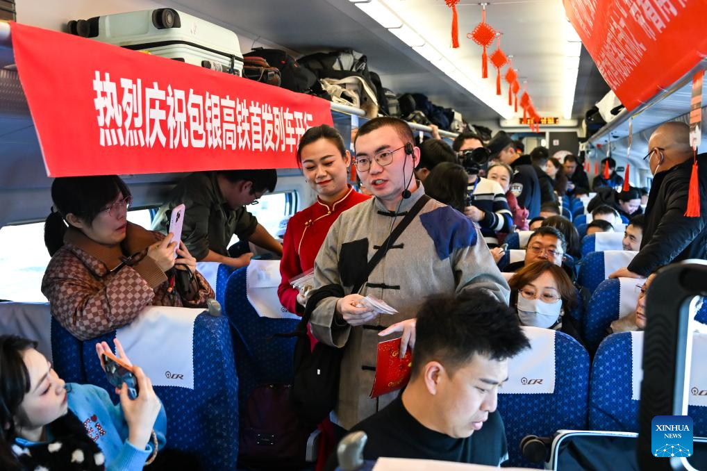 A performer (C) interacts with passengers on bullet train No.D4667, the first train of the Baotou-Yinchuan High-Speed Railway, Dec. 23, 2025. The Baotou-Huinong section of the Baotou-Yinchuan High-Speed Railway was completed and opened to traffic on Tuesday, marking the full-line operation of the railway.
