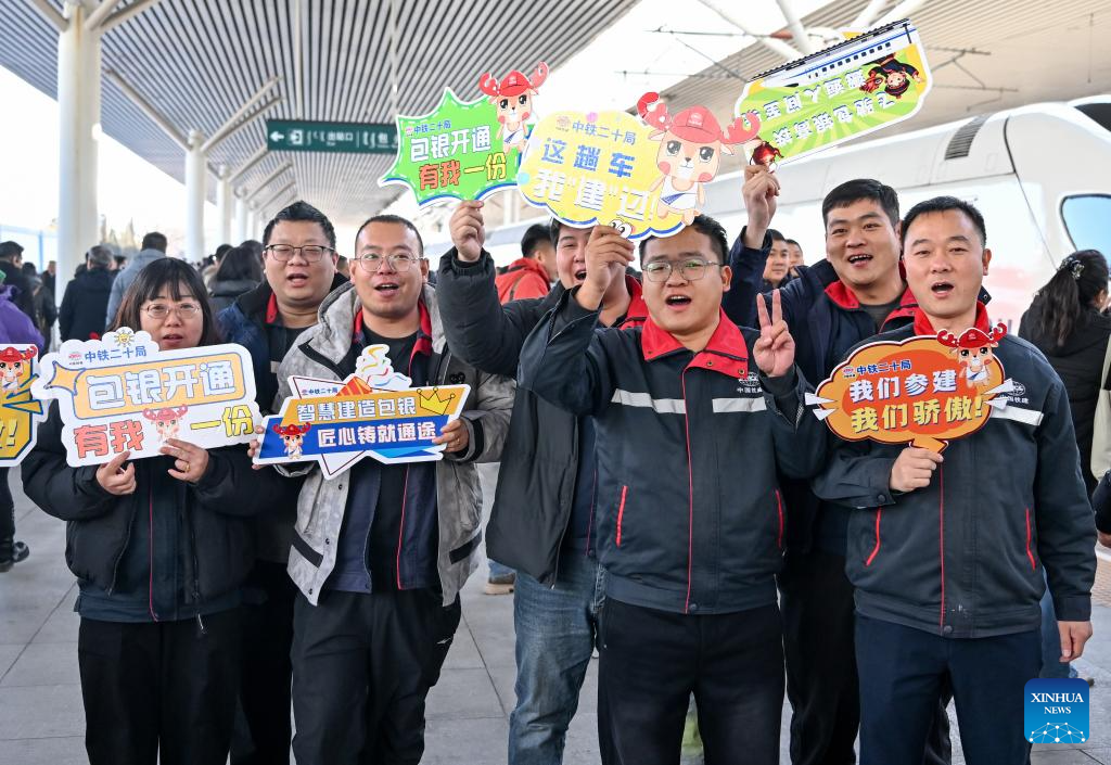 Constructors of the Baotou-Yinchuan High-Speed Railway pose for a group photo with bullet train No.D4667, the first train of this railway, at Baotou Railway Station in Baotou, north China’s Inner Mongolia Autonomous Region, Dec. 23, 2025. The Baotou-Huinong section of the Baotou-Yinchuan High-Speed Railway was completed and opened to traffic on Tuesday, marking the full-line operation of the railway.