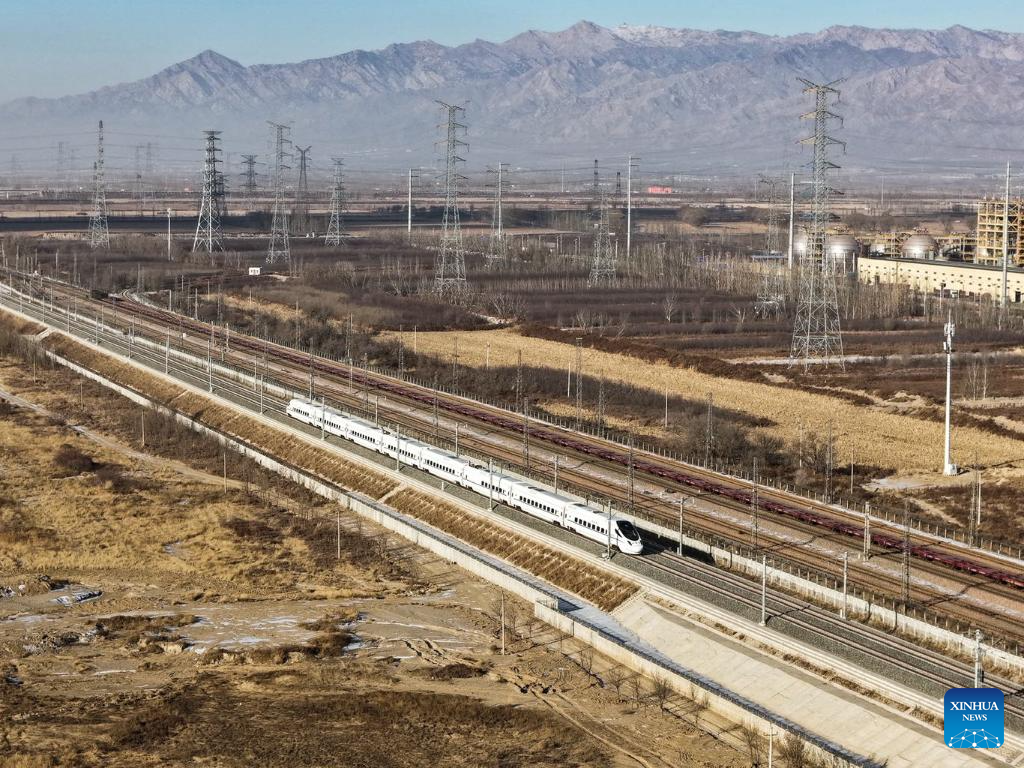 A drone photo taken on Dec. 23, 2025 shows bullet train No.D4667 running on the Baotou-Yinchuan High-Speed Railway. The Baotou-Huinong section of the Baotou-Yinchuan High-Speed Railway was completed and opened to traffic on Tuesday, marking the full-line operation of the railway.