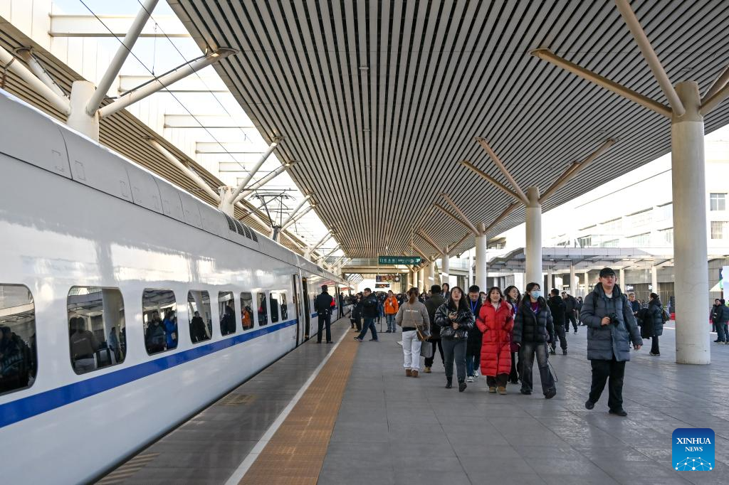 Passengers prepare to board bullet train No.D4667, the first train of the Baotou-Yinchuan High-Speed Railway, at Baotou Railway Station in Baotou, north China’s Inner Mongolia Autonomous Region, Dec. 23, 2025. The Baotou-Huinong section of the Baotou-Yinchuan High-Speed Railway was completed and opened to traffic on Tuesday, marking the full-line operation of the railway.