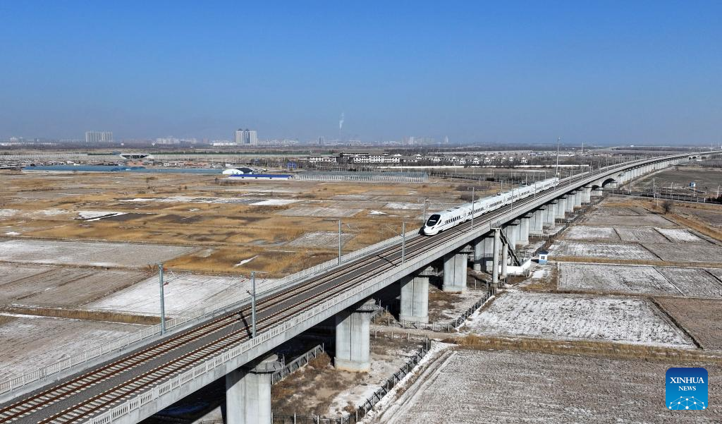 A drone photo taken on Dec. 23, 2025 shows bullet train No.D4667 running on a grand bridge along the Baotou-Yinchuan High-Speed Railway. The Baotou-Huinong section of the Baotou-Yinchuan High-Speed Railway was completed and opened to traffic on Tuesday, marking the full-line operation of the railway.