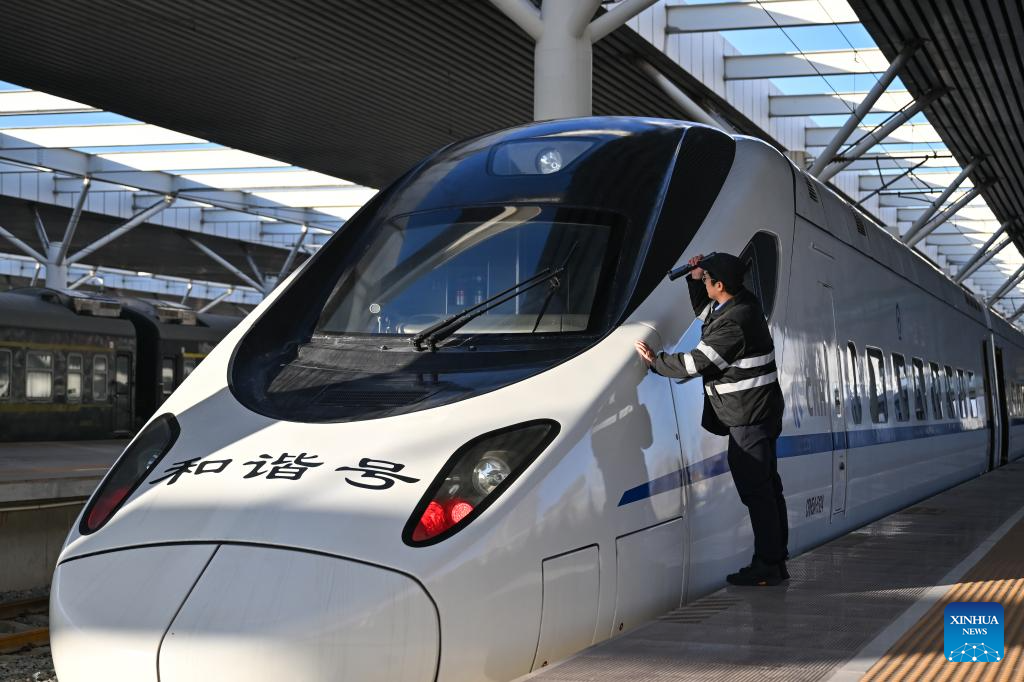 A staff member checks the first train of the Baotou-Yinchuan High-Speed Railway at Baotou Railway Station in Baotou, north China’s Inner Mongolia Autonomous Region, Dec. 23, 2025. The Baotou-Huinong section of the Baotou-Yinchuan High-Speed Railway was completed and opened to traffic on Tuesday, marking the full-line operation of the railway. (Xinhua/Li Zhipeng)