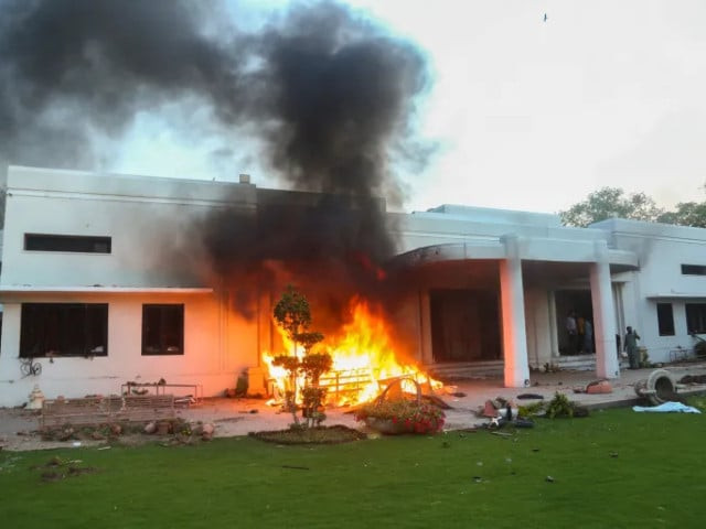 The Jinnah House (Lahore Corps Commander House), which was set afire by supporters of former prime minister Imran Khan during a protest against his arrest, in Lahore, on May 9, 2023. PHOTO: Reuters/FILE