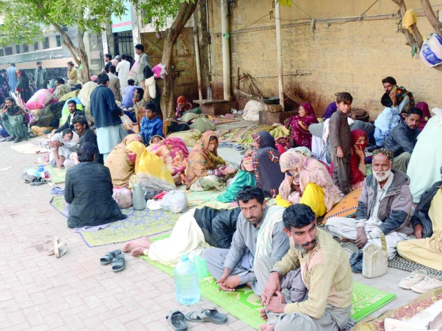 Attendants of patients from outside the city camp in an open space at the Civil Hospital due to lack of free shelters. Photo: Jalal Qureshi/Express