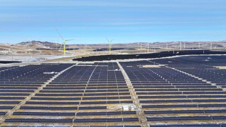 In the city of Chifeng in Inner Mongolia, rows of wind turbines and solar panels generate electricity to power a nearby zero-carbon hydrogen industrial park. This is China’s largest-scale green hydrogen and ammonia project to date.