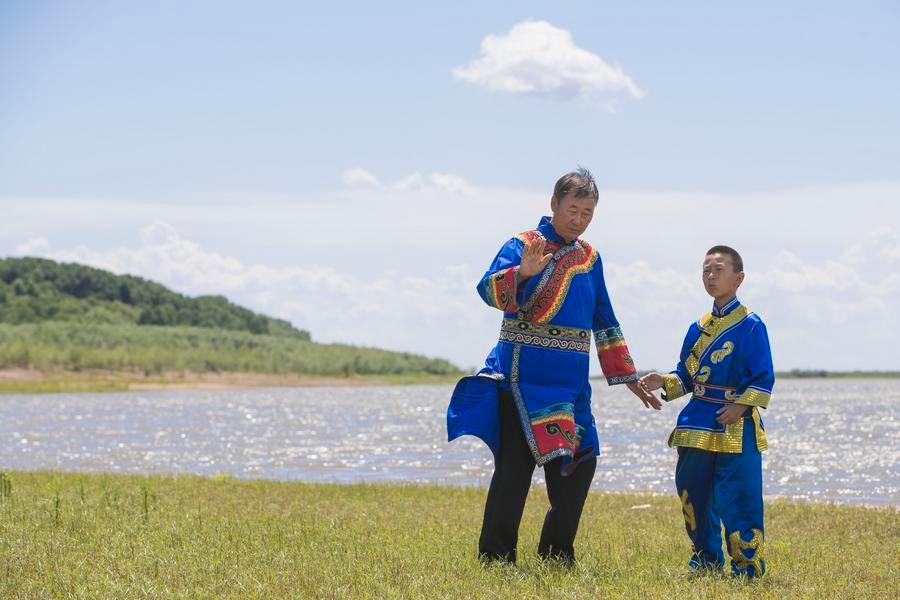Wu Baochen, an inheritor of Hezhe Yimakan, teaches a child at Jiejinkou Hezhe Township in Tongjiang City, northeast China’s Heilongjiang Province, June 13, 2020. (Xinhua/Zhang Tao)
