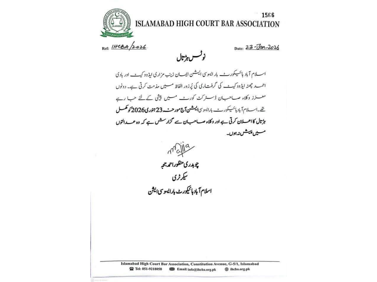 Separately, the IHCBA demanded strict action against those responsible for the arrests, warning that such incidents undermine the rule of law and threaten the independence and security of legal professionals. The association said lawyers across Islamabad would remain united in their struggle for justice and the protection of their rights.