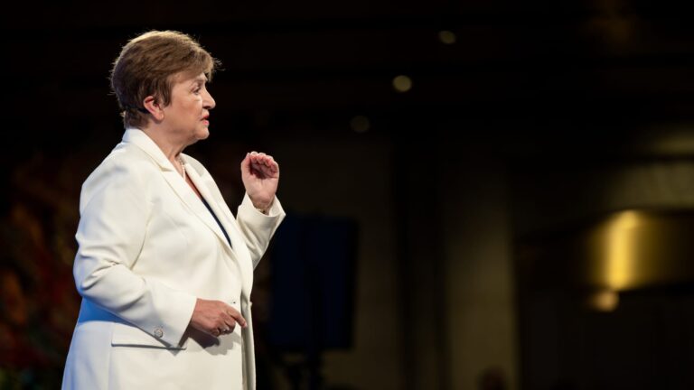 Kristalina Georgieva, managing director of the International Monetary Fund (IMF), during a curtain raiser speech ahead of the International Monetary Fund (IMF) and World Bank Fall meetings at The Milken Institute in Washington, DC, US, on Wednesday, Oct. 8, 2025.