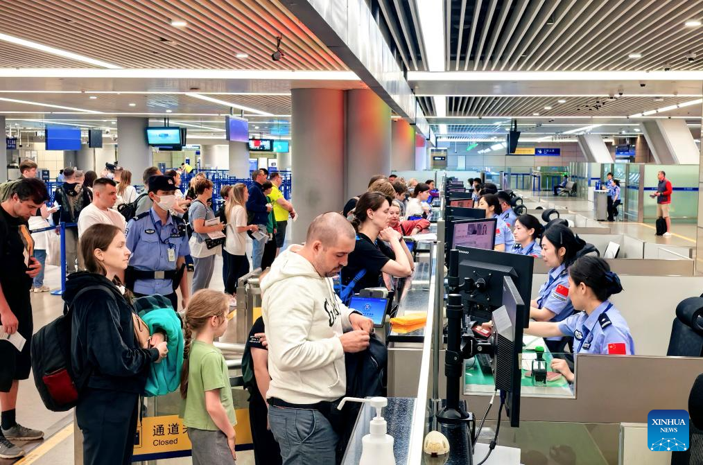 Inbound tourists go through border inspection check at Shanghai Pudong International Airport in Shanghai, east China, July 16, 2025. Thanks to China’s visa-free policies and related measures, the popularity of both travel and shopping in China among foreigners has risen, serving as a boost to the country’s tourism development.