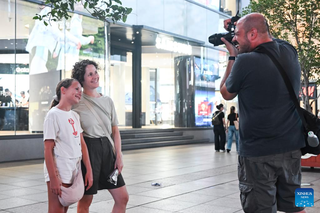 Tourist Paolo Braconi (R) from Italy takes photos for his wife Laura Brioschi (C) and daughter Bianca Braconi, at Nanjing Road in Shanghai, east China, July 17, 2025. Thanks to China’s visa-free policies and related measures, the popularity of both travel and shopping in China among foreigners has risen, serving as a boost to the country’s tourism development.