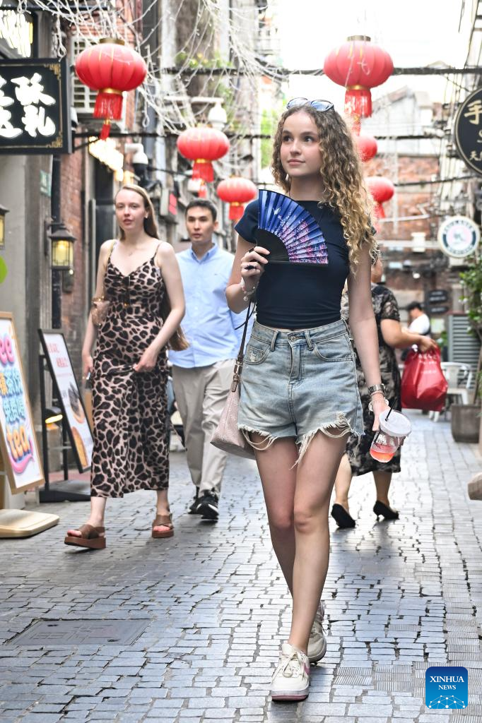 Tourist Sonya Buryak from Russia visits Tianzifang art area in Shanghai, east China, July 21, 2025. Thanks to China’s visa-free policies and related measures, the popularity of both travel and shopping in China among foreigners has risen, serving as a boost to the country’s tourism development.