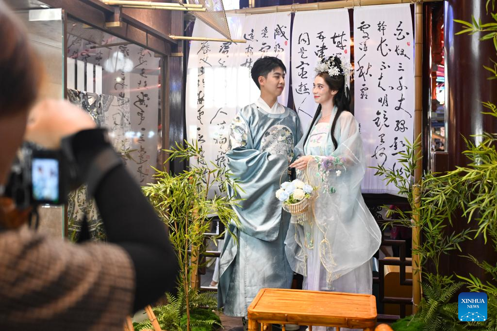 Tourists from Austria wearing Hanfu attires pose for photos at Yuyuan Garden Mall in Shanghai, east China, July 21, 2025. Thanks to China’s visa-free policies and related measures, the popularity of both travel and shopping in China among foreigners has risen, serving as a boost to the country’s tourism development.