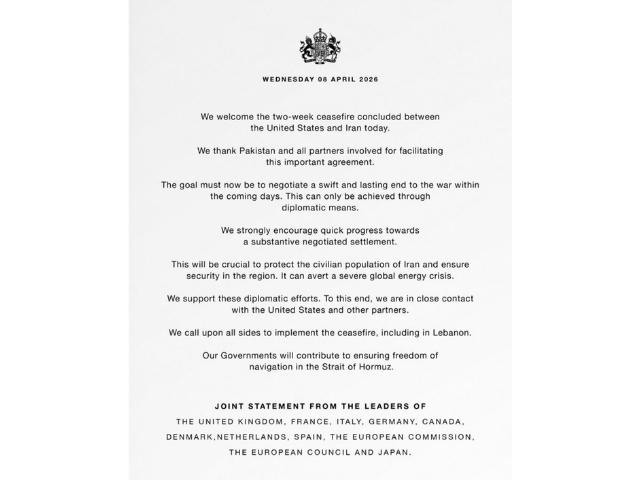 In a joint statement on Thursday, the leaders of Canada, Japan, and many European nations welcomed the “two-week ceasefire concluded between the United States and Iran today.”