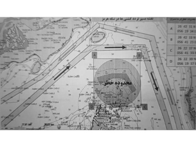 The circle on the map below is labelled an “area of danger”. The IRGC Navy says ships must coordinate with them to avoid naval mines.