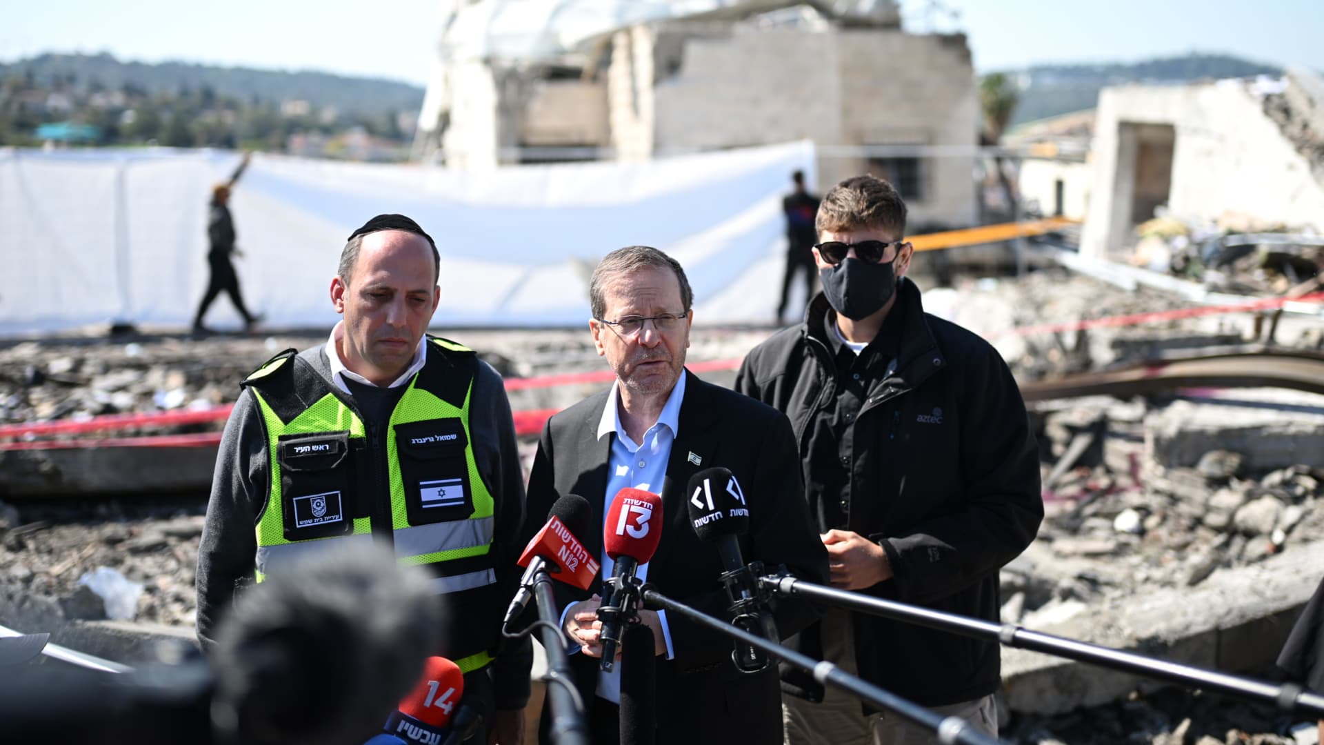 Israeli President Isaac Herzog visits the site of an Iranian strike on March 2, 2026 in Beit Shemesh, Israel.
