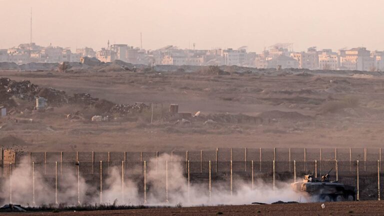 This picture taken from a position on the Israeli border with the Gaza Strip, shows an Israeli armoured personnel carriers driving along the separation barrier on August 20, 2025.