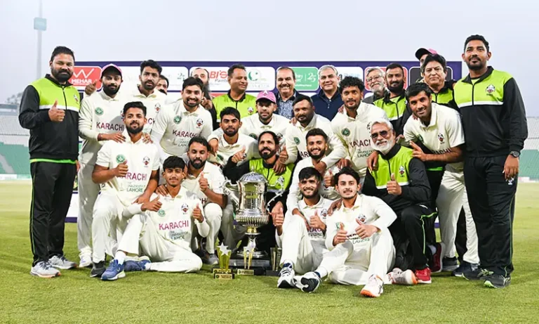 Sialkot, chasing an improbable 533 for victory, resumed the final day on 12 without loss and were dismissed for 314 in 71.1 overs. Though Afzaal Manzoor, Abdullah Shafique, and Hamza Nazar registered half-centuries, Karachi’s pace spearhead Saqib Khan delivered another decisive spell to secure the title for Saud Shakeel’s side.