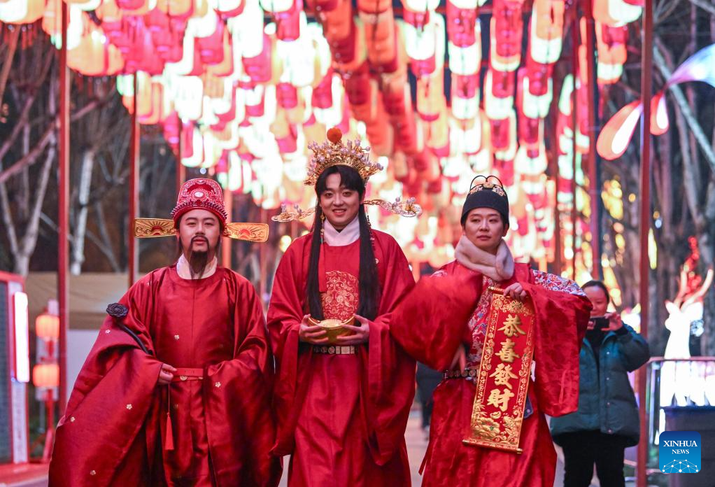 Staff members in traditional costumes interact with the visitors at a lantern festival at the Garden Expo Park in southwest China’s Chongqing Municipality, Jan. 30, 2026.