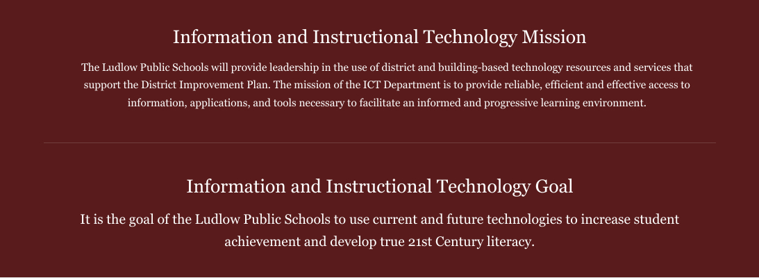 I have been working at Ludlow High School for three years and we have recently seen great advancements in technology, including high performance computers and state of the art touch screen smart boards. All of these advancements have been brought to us by the Technology Department.