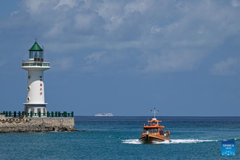 This photo taken on March 19, 2026 shows a maritime transport support vessel travelling in the waters of Sansha, south China’s Hainan Province. On Jan. 7, 2025, maritime transport support vessels were officially put into operation for routes between Yongxing Island and Zhaoshu Island.
